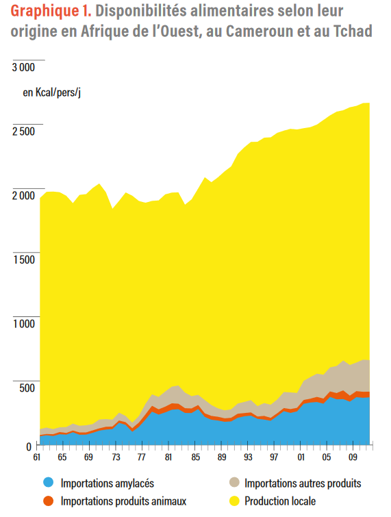 La crise des prix alimentaires internationaux en 2008 et 2010 et les émeutes « de la faim » qu’elle a provoquées dans de nombreuses villes africaines ont rappelé la dépendance alimentaire de nombre de pays du continent vis-à-vis des marchés internationaux. Entre 1961 et 2011, la part des importations dans les disponibilités alimentaires énergétiques est passée de 7 à 25 % en Afrique de l’Ouest, au Cameroun et au Tchad (graphique 1). Les disponibilités alimentaires sont la somme des quantités de la production et du solde des échanges (import moins export) diminuée des usages non alimentaires de tous les produits. Calculées pour chaque pays et chaque année, elles représentent une estimation de la quantité d’aliments disponibles pour l’alimentation humaine. Un tel constat est à l’origine des politiques de relance de la production agricole du continent. Or, si la production alimentaire par habitant a stagné entre les années 1960 et 1980, on observe un inversement de tendance depuis. Cette production est en augmentation constante depuis trente-cinq ans alors que la croissance démographique et surtout l’urbanisation sont restées rapides.