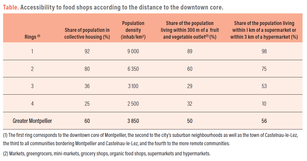 – In Greater Montpellier, there are major differences in physical access to food shops depending on the distance from the city centre. Communities on the remote periphery are the furthest away from shops selling fruit and vegetables.