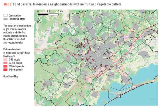 Map 2 identifies food deserts, i.e. portions of grid squares in which residents are in the first income bracket (those with an average income of less than €21,000/per capita/year) and living more than 300 m from a fruit and vegetable outlet. These food desert areas were not very extensive and were mainly located in neighbourhoods on the outskirts of Montpellier, but the number of inhabitants in these areas was often substantial. Food deserts were seldom in neighbourhoods identified as priority areas under the city policy and which would require specific attention.