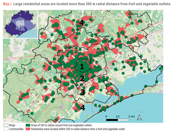 The mapping carried out facilitates identification of neighbourhoods that at first sight (given the non-exhaustiveness of the databases used) seem to have no local fruit and vegetable shops. This identification also facilitates calculation of the proportion of the resident population with access to such local shops, and analysis on how this proportion varies according to the proximity to the city centre and the income level in the neighbourhood.