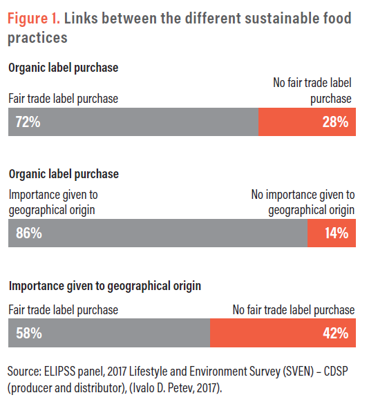 In the SVEN survey, sustainable food practices refer to the purchase of products labelled as “organic” or “fair trade” or that indicate their geographical origin : 51% of individuals report taking the organic label into account in their purchases, 43% the fair trade label, and 66% the geographical origin of the products. Moreover, there is some convergence in the adoption of these sustainable practices, as most individuals who take the organic label into account in their purchases also take the fair trade label and/or the geographical origin of products into account, and vice versa. Among the respondents who buy products labelled “organic”, 72% also buy products labelled “fair trade”, and 86% take into account products’ geographical origin. Finally, 58% of those who take into account the origin of food products also buy fair trade products (Figure 1).