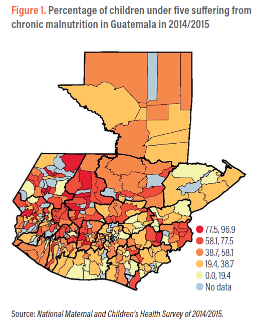 The country is ranked as an upper middle-income country and its gross national income per capita was US$4,610 in 2019 [2]. Yet poverty and inequality are still highly persistent and among the highest in the LAC region: 28.8% of the population live in multidimensional poverty, the largest proportion in Latin America after Haiti. One of the most pressing problems is the very high rate of child undernu-trition. One in two children under the age of five face chronic malnutrition and 12.6% are under-weight. These rates are among the highest in the LAC region and the world. The greatest levels are found in the western province of the country, where most of the indigenous population lives. The percentage of children under five who suffer from chronic malnu-trition is as high as 60-90% in some municipalities, whereas the average in the rest of the country does not exceed 40% (Figure 1).