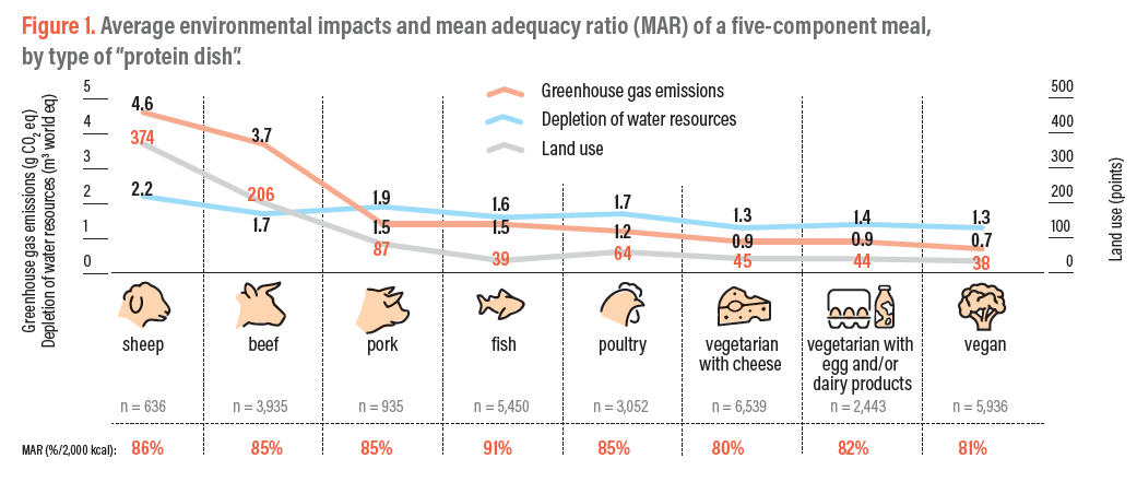Analysis at meal level shows that the type of “protein dish” chosen has a significant influence on the environment, particularly on GHG emissions, and relatively little influence on nutritional quality. Meals containing sheep or beef have the highest environmental impact, whereas those without meat or fish have the lowest (Figure 1).