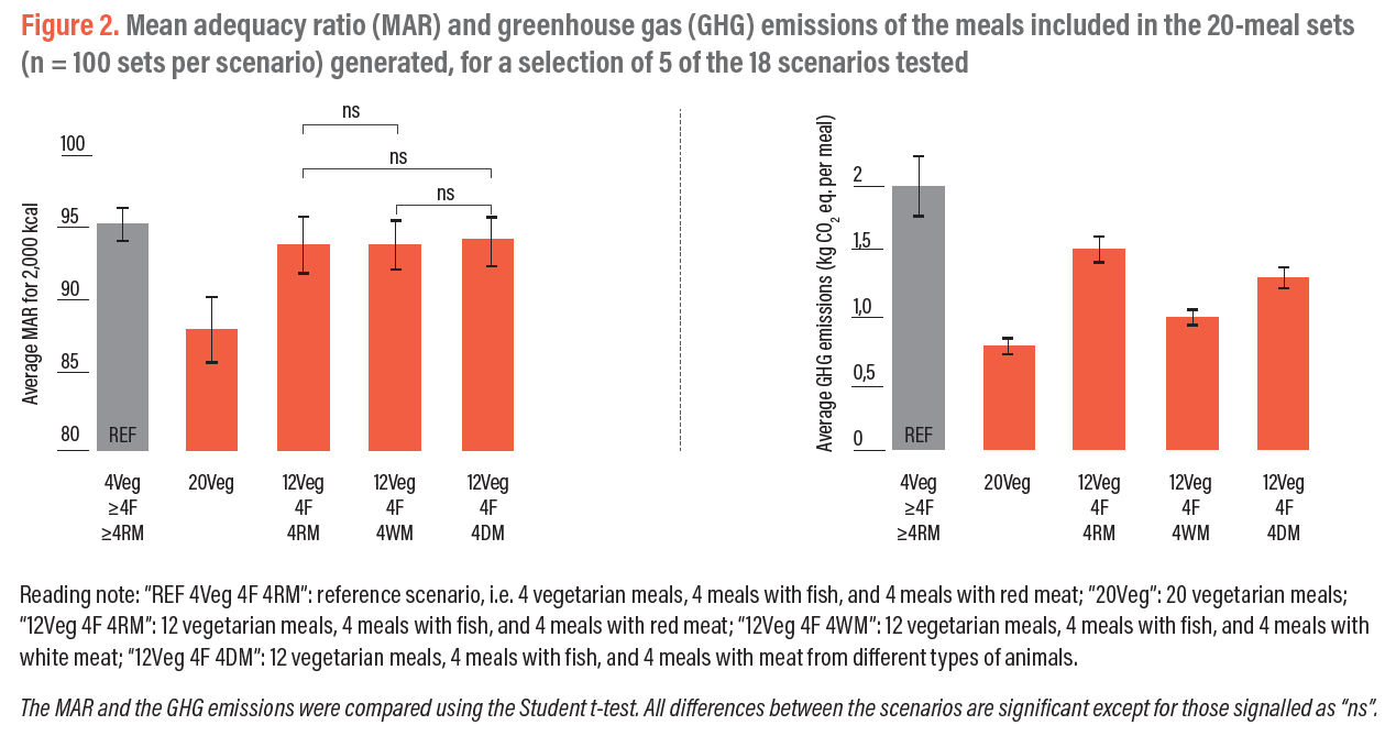 – Compared to the reference scenario, making all 20 meals vegetarian would reduce environmental impacts (with a 61% reduction in GHG emissions in particular) but would also reduce the meals’ nutritional quality (MAR = 88%);