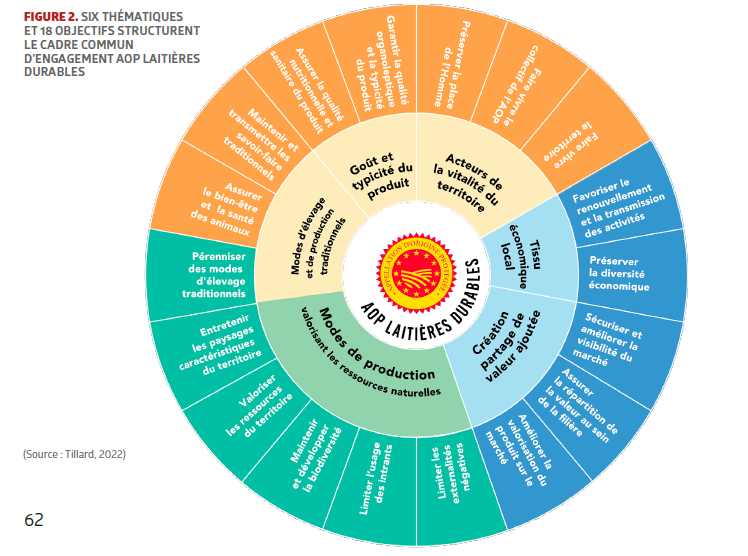 (Figure 1) dans les cahiers des charges. Cette révision doit se faire à l’horizon 2030. Cela va nécessiter une forte implication des éleveurs et de leurs représentants, ainsi que du personnel de l’INAO. Or la pertinence du processus pose question au sein du réseau des ODG. Les cahiers des charges (CDC) définissent un processus de production, une aire géographique, etc. Certaines de ces AOP laitières ont été créées dès les années 1950 (sous l’intitulé d’appellation d’origine contrôlée) dans le but de protéger un savoirfaire et de valoriser un territoire. L’inclusion de critères de durabilité induit donc un changement de paradigme, notamment sur le plan environnemental, alors que les AOP n’ont pas comme vocation première la protection de l’environnement. Pourtant une animatrice d’ODG explique que ces mesures sont relativement simples à mettre au cahier des charges » (Renard, 2023). Il est aussi aisé d’associer des indicateurs de suivi quantitatifs.