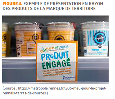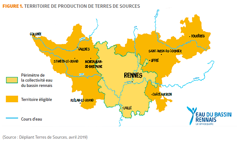 En 2017, la CEBR décide de déposer la marque collective de territoire Terres de Sources® afin de développer la commercialisation grand public. Cette marque de territoire permet d’offrir davantage de débouchés et donc d’augmenter le nombre d’agriculteurs participant au projet car « la commande publique ne peut pas répondre seule à l’ensemble des marchés des producteurs » (Noisette, 2020). L’objectif d’ici 2028 est de réunir 25 % des deux mille exploitations du bassin rennais. La marque permet aussi d’élargir le péri-mètre d’action du projet aux agriculteurs qui ne sont pas en amont des captages d’eau potable. La Métropole de Rennes finance le diagnostic IDEA pour ces agriculteurs.