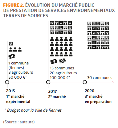 C’est pour cela que la CEBR et la Ville de Rennes ont travaillé à la création d’un marché public de prestations de services environnementaux. L’objet de ce marché public innovant est la préservation de la ressource en eau : les producteurs s’engagent à faire évoluer leurs pratiques agricoles et en contrepartie la collectivité s’engage à acheter « leurs denrées [alimentaires] durables » à « un prix juste » (Noisette, 2020) déterminé par le producteur en fonction de ses coûts de production.