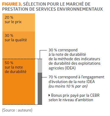 Dans le cadre du marché, la sélection se fait à 20 % sur le prix, à 30 % sur la qualité et à 50 % sur la note de durabilité (Figure 3). Cette note est définie par la méthode des indicateurs de durabilité des exploitations agricoles (IDEA) qui est un outil d’analyse de la durabilité du ministère en charge de l’Agriculture et de l’Alimentation. Une partie de la note de durabilité est définie par la situation initiale de l’exploitation, ce qui implique que celle-ci soit déjà engagée dans une démarche de durabilité [4] . Néanmoins, dans une « démarche de progrès » (Helle, 2020), plus de la moitié (70 %) de la note de durabilité est attribuée aux progrès envisagés par l’exploitant [5]. Enfin, pour encourager l’accélération du changement de pratiques, un bonus prix, payé par la CEBR, est attribué proportionnellement à l’ambition de progrès de l’exploitant.
