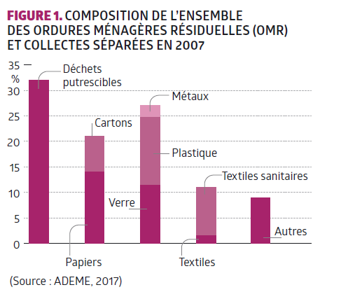 Selon la dernière campagne de caractérisation des ordures ménagères de l’ADEME, menée en 2007, nos poubelles sont composées pour plus de 30 % de déchets putrescibles, mais aussi de métaux, plastique, verre (26 %) ou encore cartons et papiers (21 %) [Figure 1].