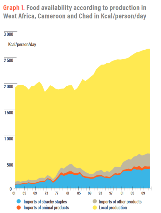 Dependence on international markets for food provision in a number of African countries became very clear during the world food price crises of 2008 and 2010 and the food riots that ensued in many cities. Between 1961 an 2011, the amount of imported food as a percentage of total food availability in West Africa, Cameroon and Chad jumped from 7% to 25% (see Graph 1). Food availability calcula-tions are based on the sum of production and the trade balance (understood here as imports minus exports), minus the measurable non-food use of food products. Calculated once per year for every country, the figure makes it possible to estimate the amount of food available for human consumption. Such observations form the basis of policies for increased agricultural production on the continent. That said, though the level of food produc-tion per capita stagnated between 1960 and 1980, the trend has since changed: for the past thirty years, food production has steadily risen, while population and urbanisation have rapidly risen. Urban lifestyles and consumption patterns, and the emergence of the middle class have long been understood as the reasons for such a reliance on food imports, which is facilitated by the system of free market exchange (Brunel, 2009).