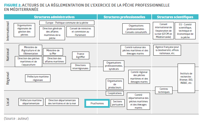 Dans les eaux sous souveraineté et juridiction française, se distinguent quatre niveaux de régulation pour la structuration de la filière pêche : les échelles européenne, nationale, régionale et locale. À chaque niveau, des organes administratifs sont chargés d’appliquer les politiques de gestion des pêches, en accord avec les recommandations des entités scientifiques.La multiplicité des acteurs (Figure 2) rend compte de la complexité de l’application des politiques et cadres réglementaires globaux de manière décentralisée.
