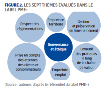 Le label RSE PME+ existe depuis 2014. Il a été créé par la Fédération des entreprises et entrepreneurs de France FEEF) et n’est donc utilisé que par ses adhérents. Ce label se base sur la norme ISO 26000. Le référentiel associé se base sur sept thèmes, présentés dans la figure 2.