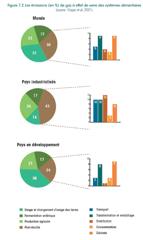 Enfin, les émissions de gaz à effet de serre (GES) constituent une troisième forme de pollution majeure. Les estimations les plus récentes indiquent qu’en 2015, à l’échelle mondiale, le système agricole et alimentaire aurait été responsable du tiers des émissions liées aux activités humaines (Crippa et al., 2021). Le quart de ces émissions (27 %) provenait des pays industrialisés, qui comptent seulement 15 % de la population mondiale. Le reste des émissions (73 %) provenait des pays « en développement », Chine incluse, rassemblant 85 % de la population mondiale. Cette répartition ne doit pas cacher une empreinte carbone plus élevée pour les ménages des pays industrialisés, qui importent des aliments dont la production dans les pays en développement (PED) émet des GES. On parle d’« émissions importées », souvent oubliées dans les calculs d’empreinte carbone. L’origine des émissions est très différente entre ces deux catégories de pays (figure 7.2). Dans les PED, les émissions de GES du système alimentaire sont liées à 71 % à l’usage des terres, à la production agricole et à l’élevage, contre 57 % dans les pays industrialisés. Dans ces derniers, les activités post-récolte (transport, transformation, emballage, distribution, consommation et gestion des déchets) représentent une part importante (43 %) des émissions. Il est intéressant de noter que le transport, que l’on cherche souvent à minimiser par la relocalisation des approvisionnements alimentaires (chapitre 17), n’y est responsable qu’à hauteur de 10 % des émissions (Crippa et al., 2021).