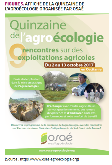 Cependant, les agriculteurs sont très sollicités et n’ont pas forcément le temps de prendre en compte toutes les demandes de rencontres ni de répondre aux questions. C’est pourquoi Osaé organise aussi des formations sur les exploitations et des visites à la ferme. Elles sont organisées par Solagro et ouvertes à tous. Cela permet de centraliser les demandes et de rentrer directement en contact avec les agriculteurs de la plateforme. Afin de stimuler les échanges avec les agriculteurs du réseau Osaé, Solagro a organisé la quinzaine de l’agroécologie en octobre 2017 [Figure 5]. Dans ce cadre, neuf visites « bout de champs » ont eu lieu dans les exploitations. Elles ont attiré des agriculteurs en conventionnel comme en AB, des étudiants, des enseignants-chercheurs ou encore des conseillers techniques.