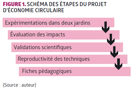 L’ensemble du projet se déroule en plusieurs étapes, [Figure 1] : des expérimentations sont menées dans les deux jardins, leurs impacts sont évalués et validés scientifiquement, leur reproductibilité est vérifiée et enfin des fiches pédagogiques sont élaborées et diffusées.