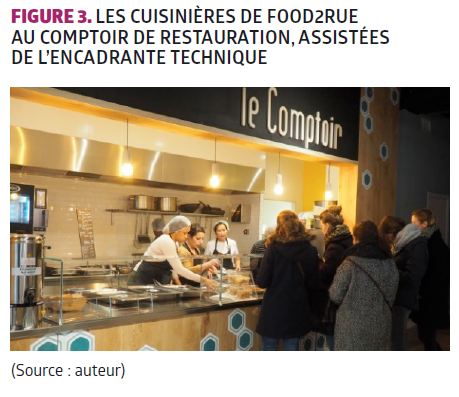 Pour le parcours d’insertion des femmes, l’association Food2rue a mis en place un « incubateur culinaire d’insertion ». Ce dispositif fait partie des structures d’insertion par l’activité économique (les SIAE, définies par l’article L5132-1 du code du travail), qui comprennent d’une part les ateliers et chantiers d’insertion (ACI) et les entreprises d’insertion (EI), produisant des biens et des services ; et d’autre part, les associations intermédiaires (AI) et les entreprises temporaires d’insertion (ETTI), qui mettent leurs salariés à disposition de tiers.