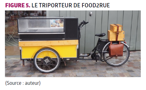 Pour répondre à la dimension « mobile » de l’activité de cuisine de rue, Food2rue a imaginé un outil de travail, le triporteur, qui permet à la fois de se déplacer, de produire et de transporter les préparations culinaires dans Paris. Celui-ci a été co-conçu par Food2rue et le Collectif Bam, un collectif et studio de design, pour être à la fois un outil de travail léger, financièrement accessible (coût d’investissement cinq à dix fois inférieur à celui d’un foodtruck) mais aussi visuellement peu impactant et plus écologique [Figure 5].