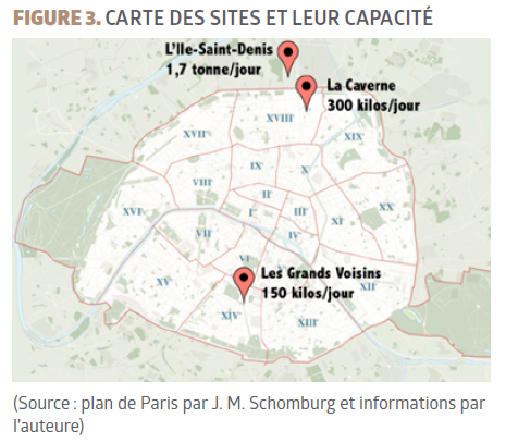 Pour y parvenir, les Alchimistes se sont pré-occupés de la norme ICPE, qui comprend un ensemble de règles strictes réservées aux « installations classées pour la protection de l’environnement ». Les sites de traitement dépassant le seuil de 2 tonnes de déchets traités par jour sont compris dans cette catégorie. Pour échapper à ces règles, les experts composteurs ont donc cantonné la quantité de déchets collectée en dessous des 2 tonnes journalières. Ils évitent, entre autres, d’être concernés par la nécessité d’une distance minimale de 250 mètres entre le site de traite-ment et les zones d’habitation alentour. Ainsi, situé aux Grands Voisins, le plus petit des sites des Alchimistes réceptionne jusqu’à 150 kg de déchets par jour, soit environ 30 tonnes par an. Celui de La Caverne, équipé de deux petits composteurs, peut, quant à lui, en traiter le double. Finalement, le plus gros site, installé à l’Île-Saint-Denis, permet de transformer 1,7 tonne de déchets journaliers, soit une moyenne de 600 tonnes à l’année (Figure 3).