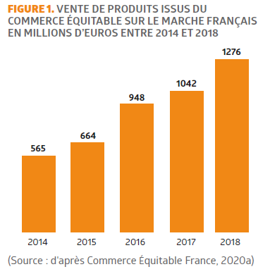 Depuis 2014, le commerce équitable s’est ouvert aux filières agricoles françaises. Il est désormais possible de vendre des produits alimentaires issus de ces filières sous le terme « commerce équitable ». L’apparition du commerce équitable « made in France » sur le marché a redynamisé le commerce équitable en général, alors qu’il était en stagnation. Selon CEF, l’intérêt pour le CE « origine France » a suscité un élan pour le commerce équitable Nord-Sud de la part des acheteurs, distributeurs et consommateurs. Ces effets sont visibles depuis 2016. Actuellement, le marché du CE est en croissance : la vente de produits issus du CE sur le marché français a doublé de 2014 à 2018, passant de 565 millions d’euros en 2014 à 1 276 en 2018 (Figure 1). En 2018, 34 % des ventes sont issues des filières françaises contre 13 % en 2014 (Commerce Équitable France, 2020a).