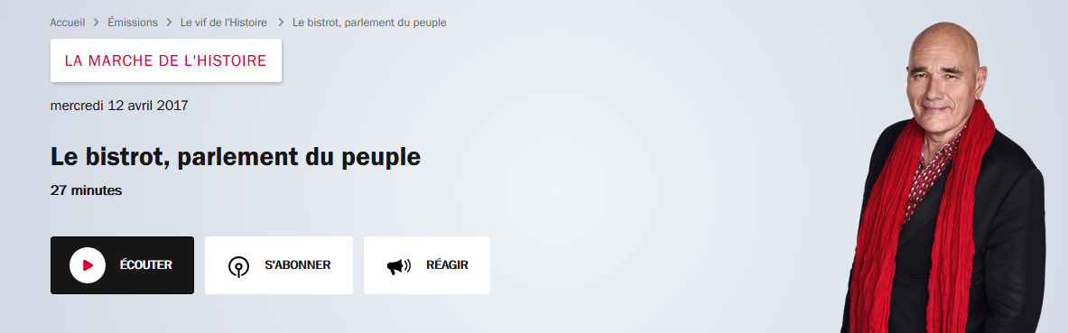 Une fois les zygomatiques bien réveillés, nous avons enchainé avec des extraits de l’émission du 12 avril 2017 "La Marche de l’Histoire" de France Inter, émission consacrée au "Bistrot, parlement du peuple".