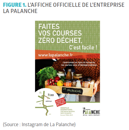 L’histoire de La Palanche commence avec Priscille Bioux et Sébastien Miau, deux des quatre cofondateurs du projet. Grands convaincus et pratiquants du « zéro déchet » depuis des années, ils ont ressenti le besoin de simplifier leurs courses en vrac. En effet, ce mode de consommation n’est pas toujours simple et demande de l’organisation et du temps. Habitant loin d’un magasin spécialisé en vrac, Priscille et Sébastien avaient ainsi pour habitude de préparer une valise de bocaux et de sachets vides, destinés à contenir leurs produits en vrac, jusqu’au magasin le plus proche qui se trouvait dans le centre-ville de Montpellier. C’est donc face à la complexité de leurs courses qu’ils décident d’agir et commencent à réfléchir à la création d’un drive en vrac. Rejoints par Marisa Peyre et Julie Boucher, ils décident de se faire accompagner par l’incubateur Alter’Incub. En octobre 2019, La Palanche arrive en 4e position sur 120 projets lors de l’appel à projets organisé par la Région Occitanie pour soutenir des innovations sur le thème de l’économie circulaire et de la réduction des déchets. En parallèle de ce soutien financier de la Région, ils décident au printemps 2020 de faire appel à un financement participatif au travers d’un crowdfunding sur la plateforme Miimosa qui leur a permis de collecter un peu plus de 10 000 euros afin d’investir dans une grande quantité de bocaux en verre. En juin 2020, un local est trouvé dans la zone industrielle de Saint-Gély-du-Fesc (situé à 10 km au nord de Montpellier) et des travaux sont lancés. Le drive « zéro déchet » La Palanche ouvre finalement ses portes en septembre 2020. Pour se faire connaître, l’ouverture officielle s’est accompagnée d’une campagne de communication. Des affiches publicitaires ont été placardées dans les abribus de Saint-Gély-du-Fesc et dans le nord de Montpellier (Figure 1). Des articles sont parus dans la presse locale et les comptes Facebook et Instagram officiels de La Palanche ont joué un rôle essentiel pour rassembler et alimenter une communauté de soutien au projet.