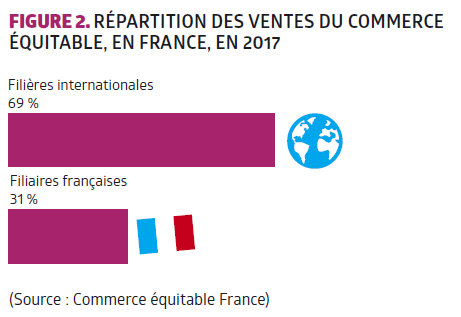 En 2016, le commerce équitable « origine France » représentait un chiffre d’affaires de 275 millions d’euros (Plateforme pour le commerce équitable, 2017) et impliquait cinq cents producteurs en France. C’est un secteur à croissance rapide : les ventes de produits ont augmenté de 155 % entre 2015 et 2016, et en 2017 le commerce équitable de produits issus de filières françaises a représenté environ un tiers des ventes du commerce équitable en France [Figure 2].