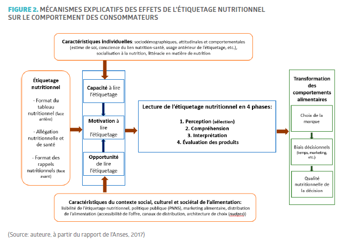 La question des habitudes alimentaires est complexe, ce qui expliquerait pourquoi l’étiquetage alimentaire, même coloriel et simplifié, n’a qu’un impact modéré sur nos comportements alimentaires. Comme décrit en figure 2, plusieurs facteurs clés génèrent des effets sur les comportements du consommateur : les caractéristiques des systèmes d’information nutritionnelle, les caractéristiques individuelles et le contexte de consommation (indiqués en orange). Ces derniers jouent sur notre capacité à et l’opportunité de lire les étiquetages nutritionnels et, in fine, influence notre motivation à les lire (en bleu sur la figure). Une fois la décision prise de lire l’étiquetage nutritionnel, un processus cognitif en quatre étapes successives permet de décoder l’étiquetage, puis de prendre une décision pour transformer ou non la lecture en acte d’achat. D’autres facteurs entrent en jeu dans la décision comme les marques, le marketing alimentaire, le temps disponible, etc. (indiqués en vert). Les biais sont donc nombreux et il est difficile d’attribuer une efficacité précise et directe à un dispositif alors que les facteurs d’influence sont multiples, comme expliqué dans la figure.