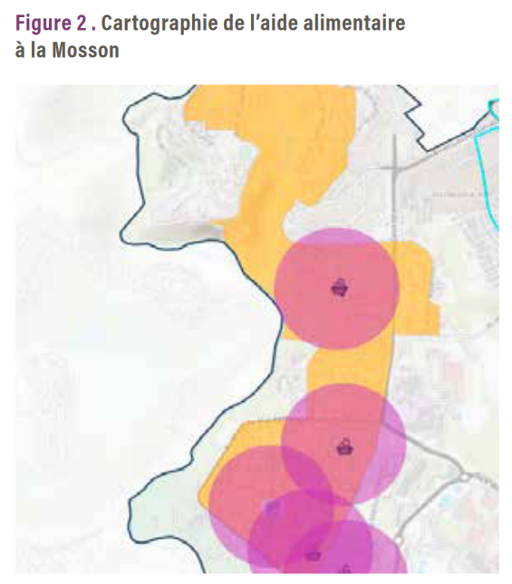 L’accessibilité physique aux structures est un facteur primordial pour y recourir. L’enquête auprès des personnes en situation de précarité alimentaire montre que la proximité géographique des lieux de distribution dans le quartier de résidence voire avec une connexion simple avec un seul transport en commun sont très importants pour y accéder. L’étude sur les paysages alimentaires du Grand Montpellier (projet de recherche Surfood-Foodscapes), menée par une équipe pluridisciplinaire de chercheurs du Cirad, de l’Inrae et de Montpellier SupAgro utilise un périmètre de proximité d’un rayon de 300 m à vol d’oiseau, soit près d’un kilomètre aller-retour en empruntant les rues, considéré comme une limite au-delà de laquelle les habitants ont du mal à se déplacer à pied pour leurs courses alimentaires. Si on s’intéresse particulièrement au QPV de la Mosson, on observe que même s’il y a des structures d’aide alimentaire, le quartier des Hauts-de-Massane, situé à plus de 300 m de celles-ci, mérite une étude approfondie pour s’assurer que le taux de non recours n’y est pas supérieur aux autres quartiers.