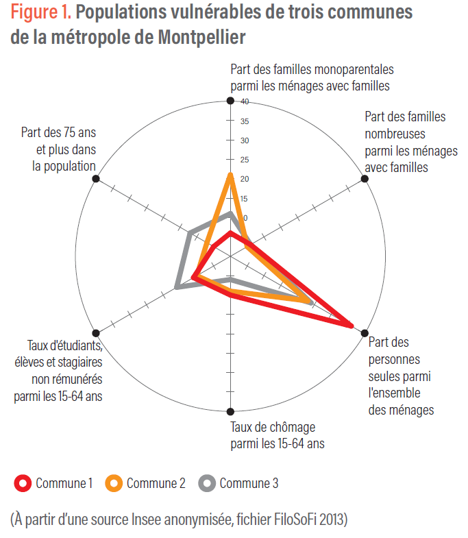 La figure montre que les communes d’étude présentent à des degrés divers des profils de vulnérabilité en raison de la présence de familles monoparentales, de personnes vivant seules et d’étudiants. Ce profil est propre à Montpellier. D’un territoire à l’autre, ces profils communaux pourront fortement varier.