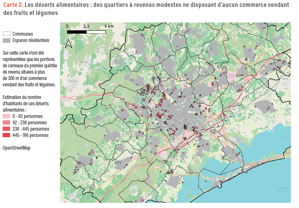 La carte 2 permet d’identifier les déserts alimentaires : les espaces à plus de 300 m de commerces vendant des fruits et légumes, situés dans des carreaux du premier quintile de revenu (ceux pour les-quels le revenu moyen est inférieur à 21 000 euros par personne et par an). Ces espaces de désert alimentaire sont peu étendus. Ils sont principalement situés dans des quartiers périphériques de la commune de Montpellier, mais le nombre de personnes qui y résident peut être important. Ils sont rarement dans des quartiers identifiés comme prioritaires par la politique de la ville et qui nécessiteraient donc une attention spécifique. D’autres quartiers à revenus modestes comportent des magasins vendant des fruits et légumes ; ils n’ont donc pas été identifiés sur cette carte comme des déserts alimentaires. Cela ne signifie cependant pas que l’offre y est toujours appropriée et accessible, si l’on considère les prix et la qualité des produits dans des petites épiceries conçues pour du dépannage mais non pour un approvisionnement régulier. Les résidents de ces quartiers à revenus modestes dépendent plus de cette offre car ils sont moins mobiles que des ménages plus aisés, qui sont souvent motorisés et ne perçoivent donc pas vraiment la distance physique aux commerces comme un problème.
