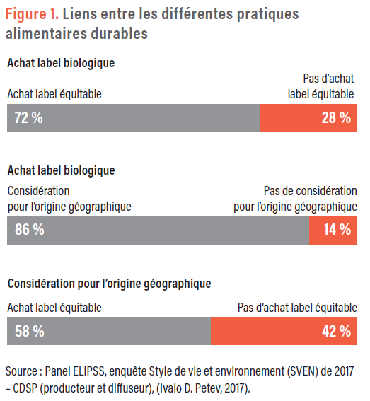 Les pratiques alimentaires durables correspondent dans l’enquête SVEN à l’achat de produits labellisés « biologique », « équitable » ou tenant compte de l’origine géographique [1] : 51 % des individus déclarent tenir compte du label biologique dans leurs achats, 43 % du label équitable et 66 % de l’origine géographique des produits. Par ailleurs, on trouve une certaine convergence dans l’adoption de ces pratiques durables dans la mesure où la majorité des individus qui prennent en compte le label biologique lors de leurs achats prennent aussi en compte le label équitable et/ou l’origine géographique des produits, et réciproquement. Parmi les individus qui achètent des produits labellisés « biologique », 72 % achètent aussi des produits labellisés « équitable » et 86 % prennent en compte leur origine géographique. Enfin, 58 % de ceux qui tiennent compte de la provenance des produits alimentaires achètent aussi des produits équitables (Figure 1).