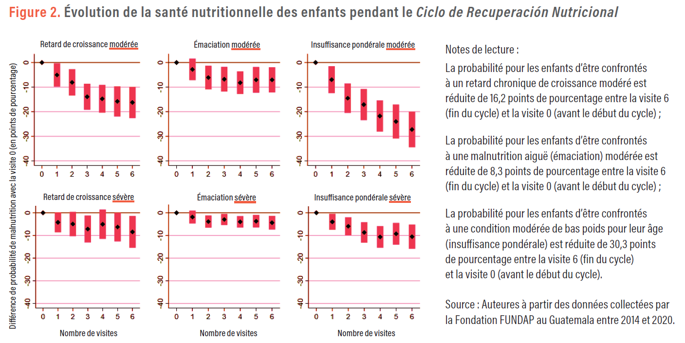 Les analyses menées montrent que l’état de santé nutritionnelle des enfants de moins de cinq ans est amélioré lorsqu’ils bénéficient d’un cycle complet. Trois indicateurs anthropométriques ont été mesurés : le retard de croissance (malnutrition chronique ou basse taille pour l’âge), l’émaciation (malnutrition aiguë ou bas poids pour la taille) et l’insuffisance pondérale (la combinaison des deux précédents) – à la fois modérés et sévères. La figure 2 indique la probabilité qu’un enfant se trouve dans l’une de ces trois conditions de mauvaise santé nutritionnelle à chacune de ses visites. Nous observons que cette probabilité diminue au fur et à mesure des visites, et ce, pour les trois types de malnutrition.