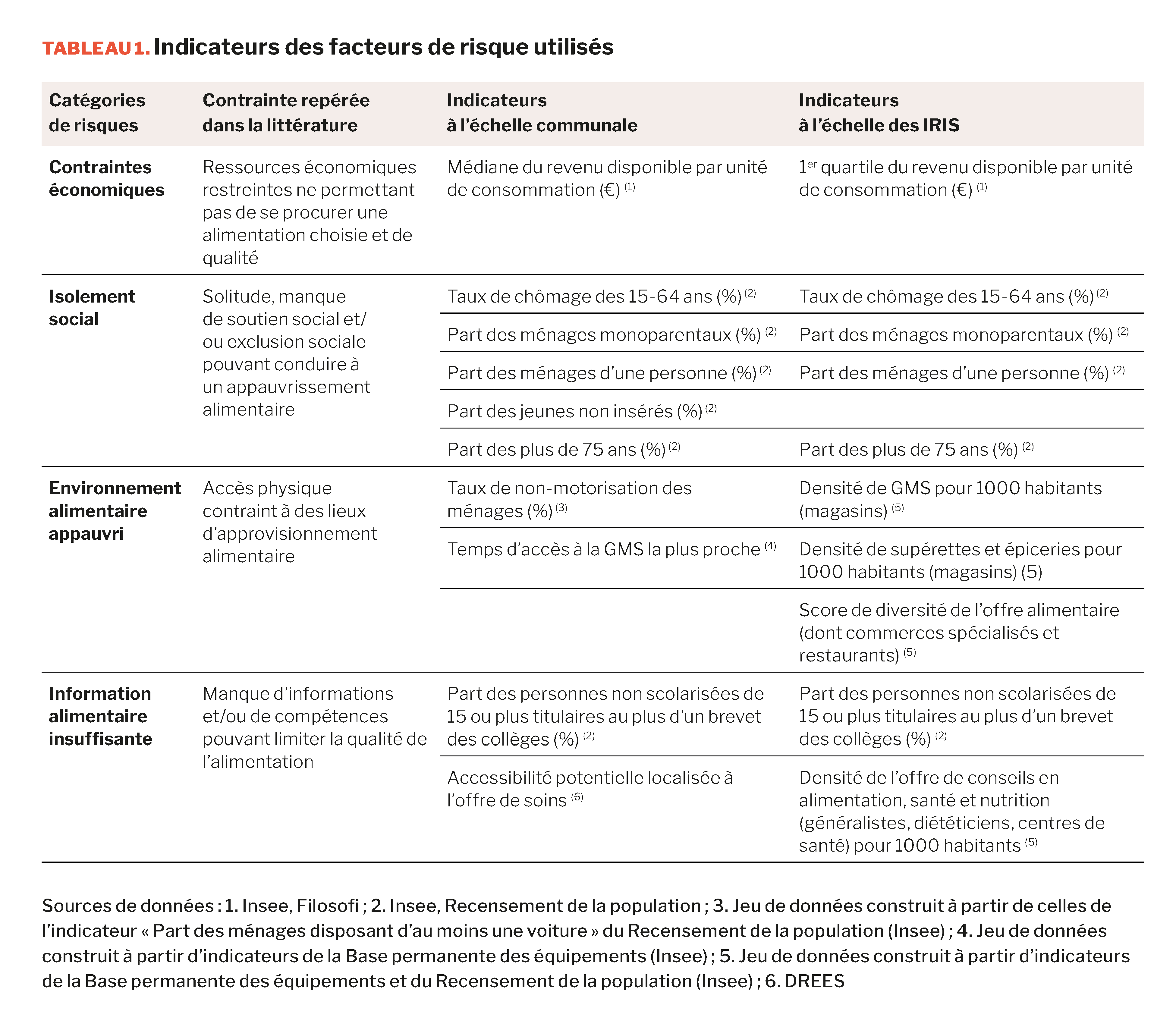 La précarité alimentaire est multifactorielle. Elle peut notamment être liée à des contraintes économiques, un isolement social, un environnement alimentaire appauvri ou encore des difficultés d’accès à de l’information. Les indicateurs utilisés dans ce travail sont détaillés dans le Tableau 1. D’autres facteurs de risque contribuent également aux situations de précarité alimentaire (état de santé, taille des logements, niveau d’équipement domestique, etc.), mais ils n’ont pas pu être intégrés, faute de données disponibles en libre accès.