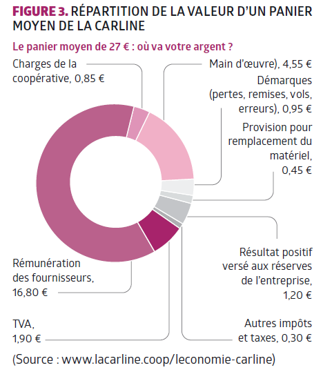 Une répartition plus équitable de la valeur économique a été mise en place dans la Biovallée et a eu pour objectif principal de profiter aux producteurs, afin de rendre leur activité viable. L’un de moyens pour y arriver a été la construction de circuits courts. L’épicerie biologique La Carline et la plateforme logistique pour les cantines Agricourt sont deux structures intermédiaires d’approvisionnement qui ont permis de mettre en lien petits producteurs bio locaux et consommateurs. Cela tout en préservant une marge importante pour les producteurs, comme le montre le graphique de la figure 3.