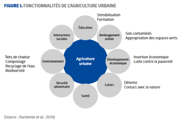 Si la dimension nourricière de l’agriculture urbaine paraît anecdotique, elle peut répondre en revanche à de nombreux défis, comme l’illustre Duchemin (Figure 1).