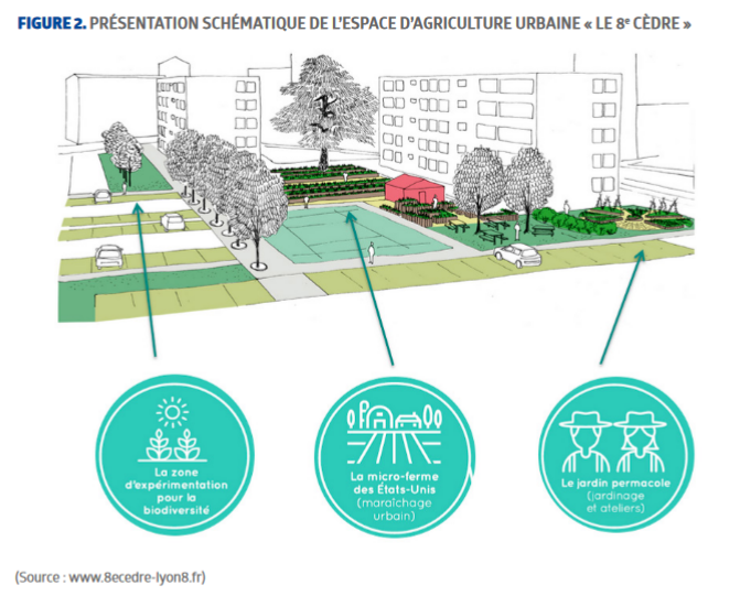 Situé dans la cour centrale d’immeubles du quartier dit « des États-Unis », le « 8e Cèdre » est présenté comme « un espace solidaire d’agriculture urbaine qui a pour ambition de participer à la construction de la ville durable », qui « allie production et vente de légumes en circuits ultra-courts, favorisant la transmission de connaissances agroécologiques, un cadre de vie et une alimentation durable, et la préservation de la biodiversité [6] ». Conçu en 2019 dans le cadre de l’appel à projets « Mon projet pour la planète », il est co-construit par le bailleur social GrandLyon Habitat, un bureau d’étude en agriculture urbaine – Le Grand Romanesco – et l’entreprise coopérative d’agriculture urbaine « Place au Terreau ».