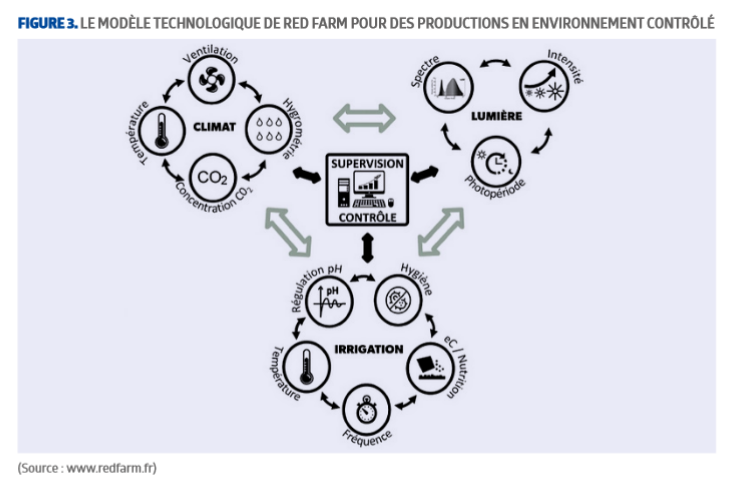 Une autre innovation en agriculture urbaine est celle de ReD FARM, qui propose la production de cultures en environnement contrôlé, c’est-à-dire hors-sol (hydroponie ou pots), en maîtrisant le climat, la lumière et l’irrigation (Figure 3). L’intérêt de ce type de production réside dans l’optimisation du process agronomique : une utilisation minimale des ressources (eau, terre arable), non recours aux pesticides, pour des rendements maximisés, avec des cycles de culture réduits de 30 % à 60 %, des plantes saines, robustes et enrichies en matières actives.