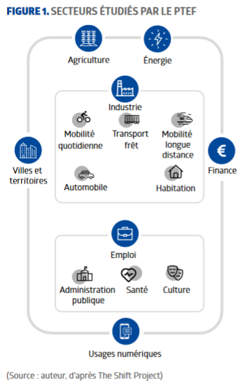 Le PTEF s’articule autour de travaux dédiés à quinze secteurs de l’économie (Figure 1) regroupés en trois catégories : les usages, les services et les secteurs amont, que sont l’agriculture et l’énergie. Des chantiers transversaux donnent du liant à ces thématiques. Ils concernent l’emploi, la finance et les territoires. Le PTEF prend en compte tous les secteurs de l’économie avec le même niveau de détail, ainsi que leurs interactions. Les liens entre le volet « agriculture et alimentation » et les autres volets sont les suivants :