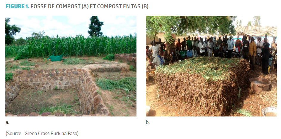 Les techniques de compostage utilisées au Burkina Faso sont le compostage en fosse et le compostage en tas des résidus de culture avec utilisation de fumier ou bouses de vache pour améliorer le rapport C / N et faciliter le compostage. Le compostage en tas présente certains avantages comparativement à celui en fosse car le producteur mobilisera moins de force physique pour le creusage de la fosse et moins de moyens financiers pour la stabilisation de la fosse (Figure 1). De nos jours, le creusage de nouvelles fosses de compostage se fait rarement, au profit du compostage en tas. Parmi les anciennes fosses de compostage, certaines continuent d’être utilisées par les producteurs pour le compostage et d’autres fosses, par manque d’entretien ou d’intérêt, sont abandonnées.