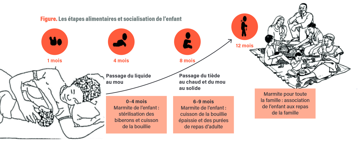 D’une façon générale, l’itinéraire alimentaire de l’enfant se traduit par le passage : 1) de la température corporelle (37°C) au tiède puis au chaud ; 2) du liquide au semi-liquide, au mou puis au solide ; 3) de la marmite individuelle (pour chauffer l’eau du biberon ou des bouillies) à la marmite du repas familial. Un enfant intégré à son groupe social est ainsi celui qui mange chaud, cuit et solide.