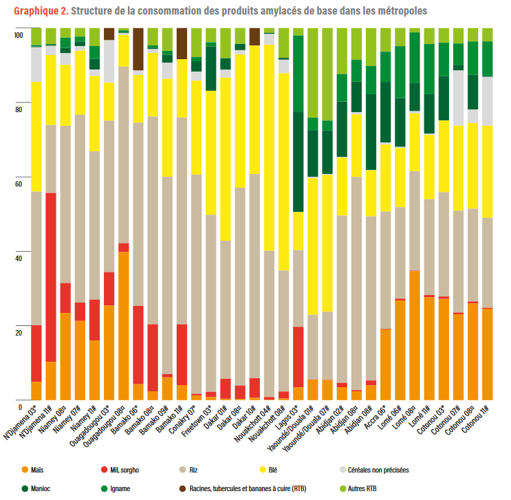 Partout, le riz et le blé occupent en ville une place prépondérante puisque ces deux céréales représentent au moins la moitié des consommations de produits amylacés de base. Mis à part à N’Djamena (Tchad) et, dans une moindre mesure, à Bamako (Mali), les mils et sorghos apparaissent partout marginalisés de la consommation des citadins. Dans les villes des pays sahéliens continentaux, le maïs a conquis une place de choix dans la ration céréalière et les racines et tubercules viennent également diversifier la ration. Dans les villes des pays du Golfe de Guinée et au Cameroun, les racines et tubercules ainsi que le maïs perdent un peu d’importance au profit du blé, mais restent quand même largement consommés.