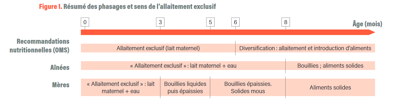 Pour les aînées, l’enfant devrait être nourri de lait maternel les huit premiers mois de sa vie comme elles déclarent qu’on le faisait auparavant. Selon elles, l’eau doit être proposée dès la naissance (en plus du lait maternel) parce que « l’enfant est un humain qui a soif aussi comme les adultes » et les aliments de complément introduits seulement à partir de huit mois.